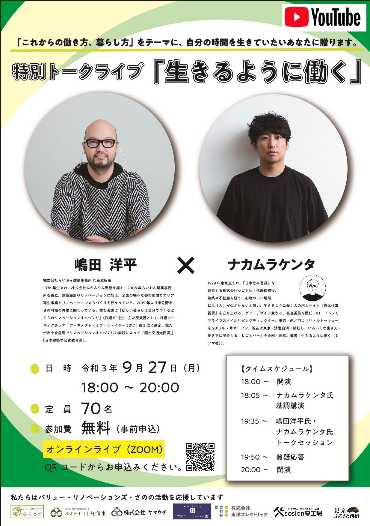 ナカムラケンタさんと嶋田洋平さんによる特別トークライブ「生きるように働く」が、リアル参加できない方が多いことを踏まえ、ナカムラさんと嶋田さんに相談させていただいたところ、ご両名より快諾をいただきましたので、開催後1週間限定でアーカイブ配信(限定配信)することが決定しました。