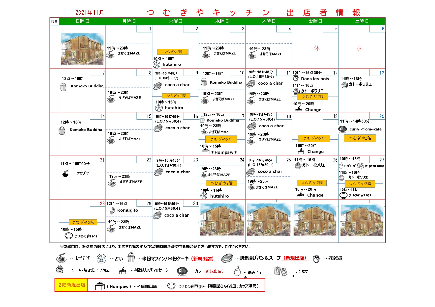【お知らせ】11月つむぎや出店者カレンダーを更新しました2021.10.31お知らせSHARE BASEつむぎや遅くなりましたが、11月のつむぎや出店者カレンダーを更新しました。今月は新規出店が3店舗、新たに2階でご利用される方が2グループとなって、さらに彩りが増していますので、ぜひお越しください。
