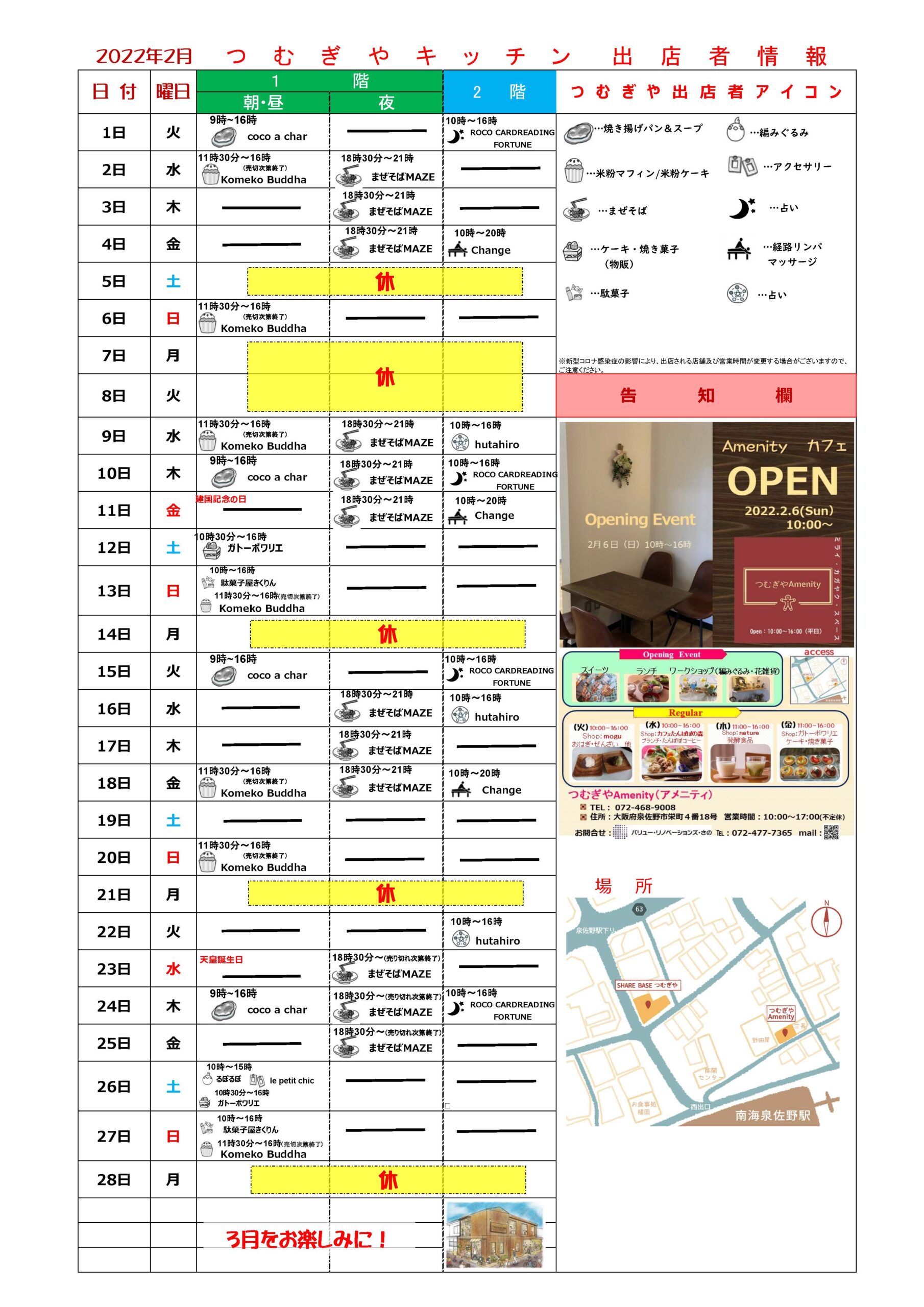 SHAREBASEつむぎや 2月度月別出店カレンダー2022.01.31お知らせSHAREBASEつむぎや 2月度月別出店カレンダーになります。コロナの状況によっては、出店内容が変更となる場合がありますのでご了承の程宜しくお願いいたします。