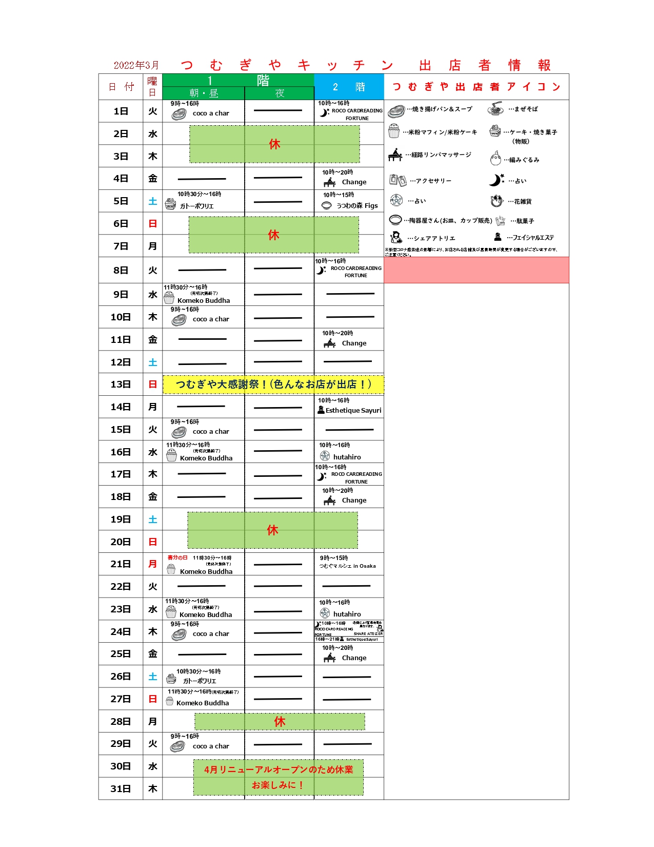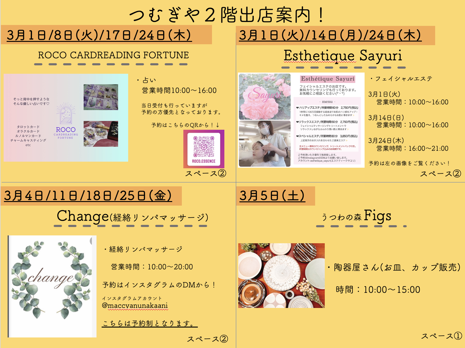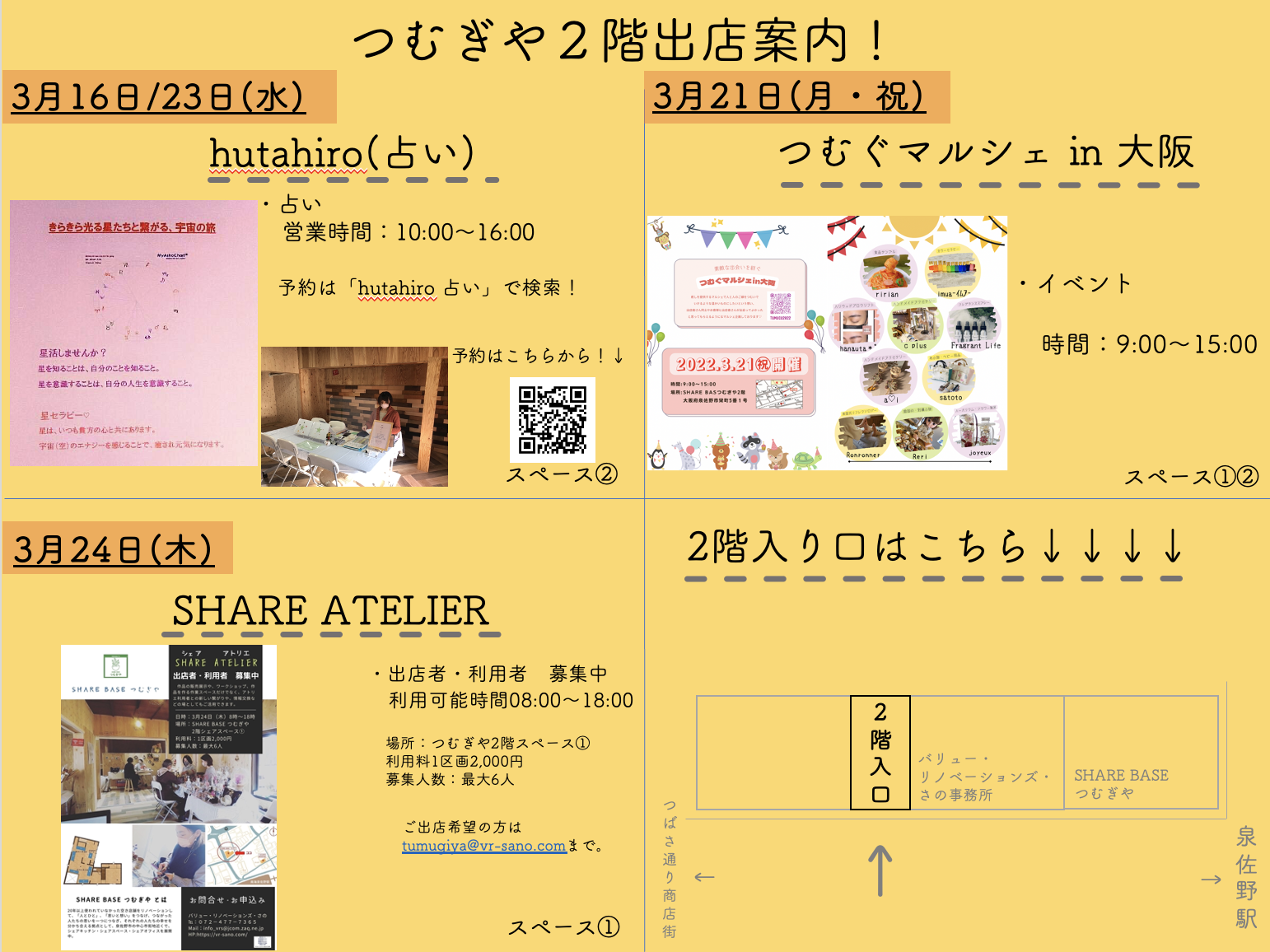 SHEREBASEつむぎや★3月の出店者情報2022.02.28お知らせSHARE BASEつむぎやSHAREBASEつむぎや 3月度月別出店カレンダーになります。コロナの状況によっては、出店内容が変更となる場合がありますのでご了承の程宜しくお願いいたします。 2階の出店者詳細はこちら↓↓↓