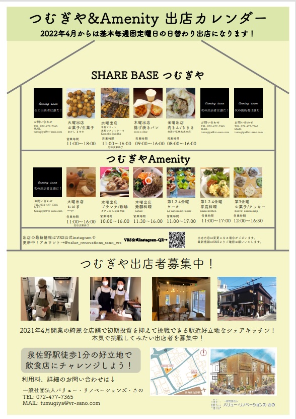 【つむぎやキッチン・Amenityカフェ】出店カレンダーを更新しました!2022.03.31お知らせSHARE BASEつむぎやつむぎやAmenity2022年4月分の「つむぎやキッチン」及び「Amenityカフェ」の出店カレンダーを更新しましたので、お知らせします。なお、つむぎやキッチンの運営が変更となり、それぞれの出店者は決まった曜日で出店していただいていますので、ご来店される前にご確認をお願いします。引き続き、SHARE BASE つむぎや、並びに、つむぎやAmenityをよろしくお願いします。毎朝6時頃当日の出店情報を更新しております!