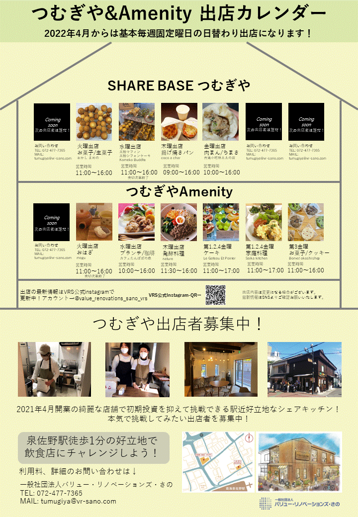 【つむぎやキッチン・Amenityカフェ】カレンダー更新致しました2022.05.31お知らせ2022年6月からの「つむぎやキッチン」及び「Amenityカフェ」の出店カレンダーを更新しましたので、お知らせします。6月から営業時間の変更があるお店がございますので、ご来店される前にご確認をお願いします。