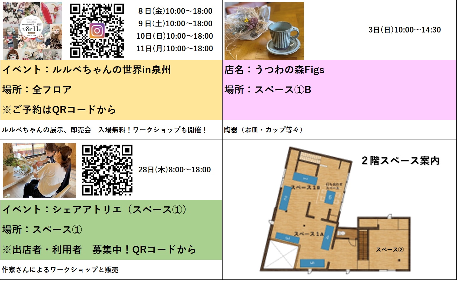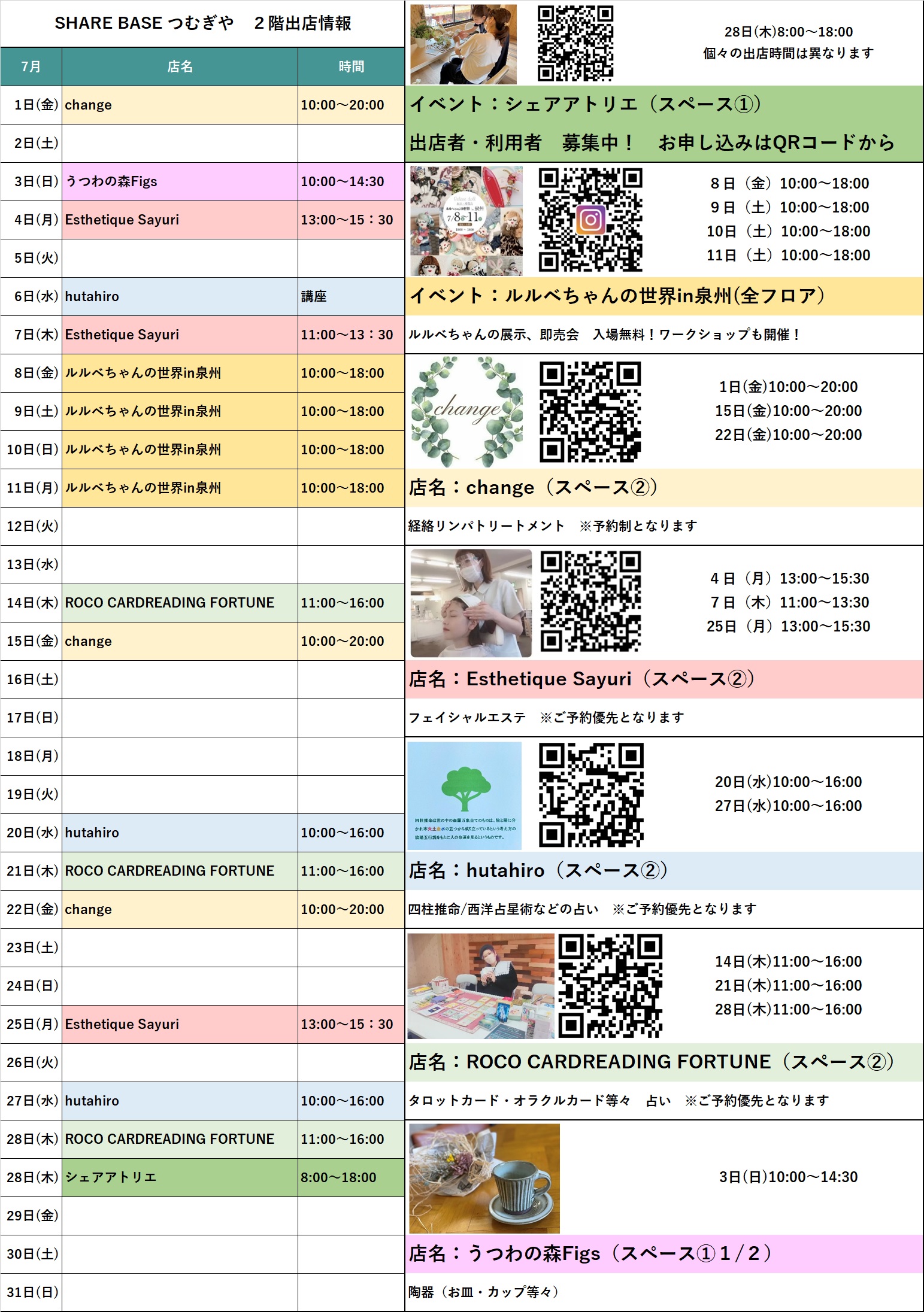 【SHARE BASE つむぎや 2階】7月出店カレンダー更新致しました