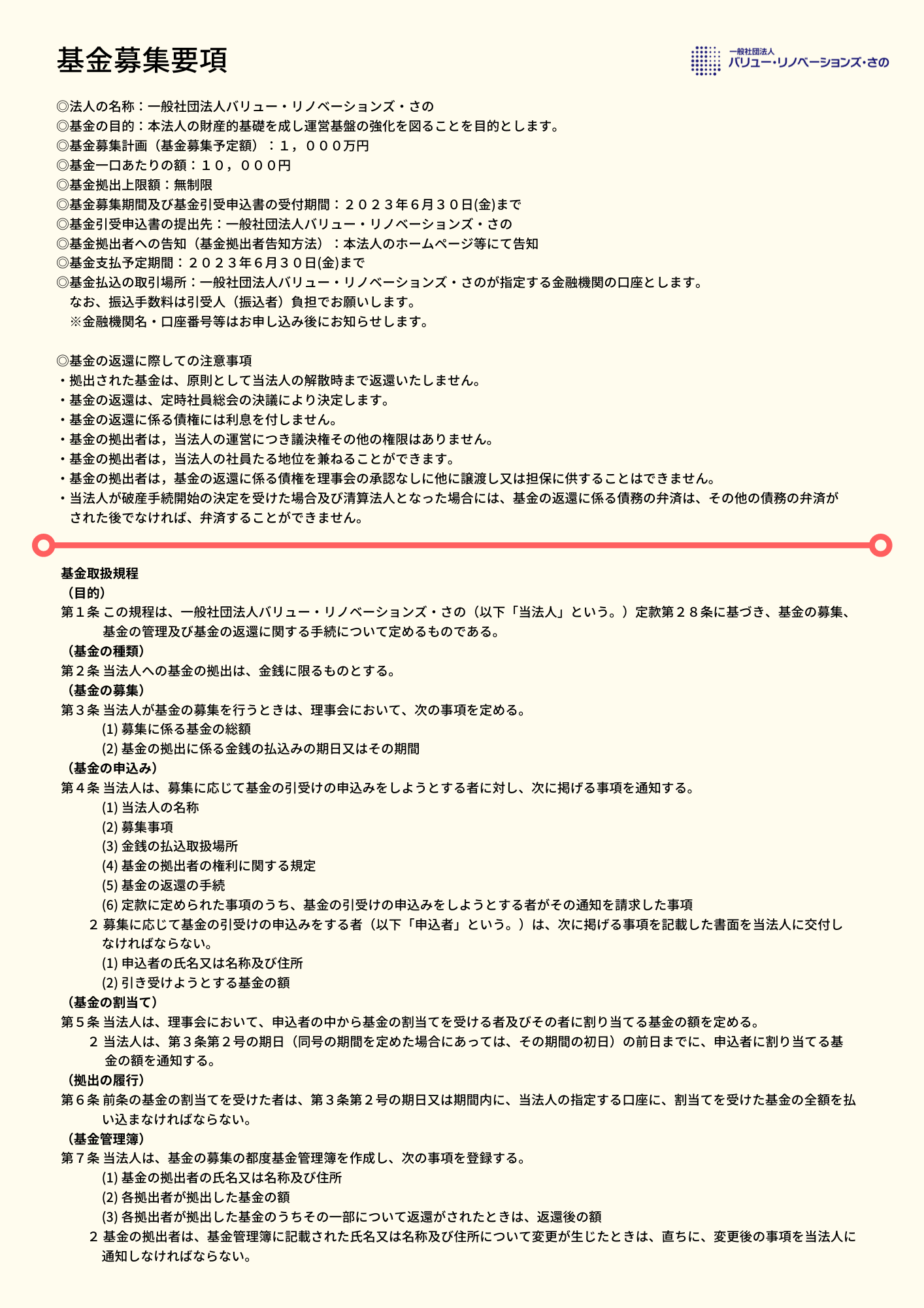 一般社団法人バリュー・リノベーションズ・さの(VRS)は、運営基盤の強化を図ることを主な目的として、基金を募集します。