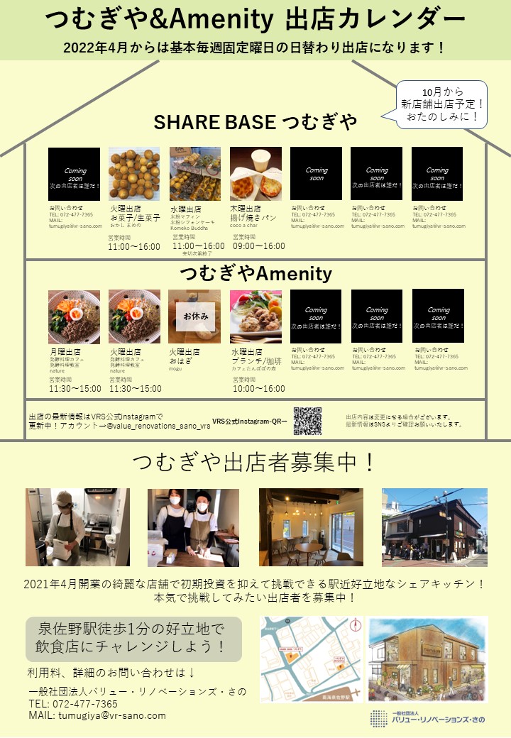 【つむぎやキッチン・Amenityカフェ】カレンダー更新致しました2022.09.01お知らせ2022年8月からの「つむぎやキッチン」及び「Amenityカフェ」の出店カレンダーを更新しましたので、お知らせします。