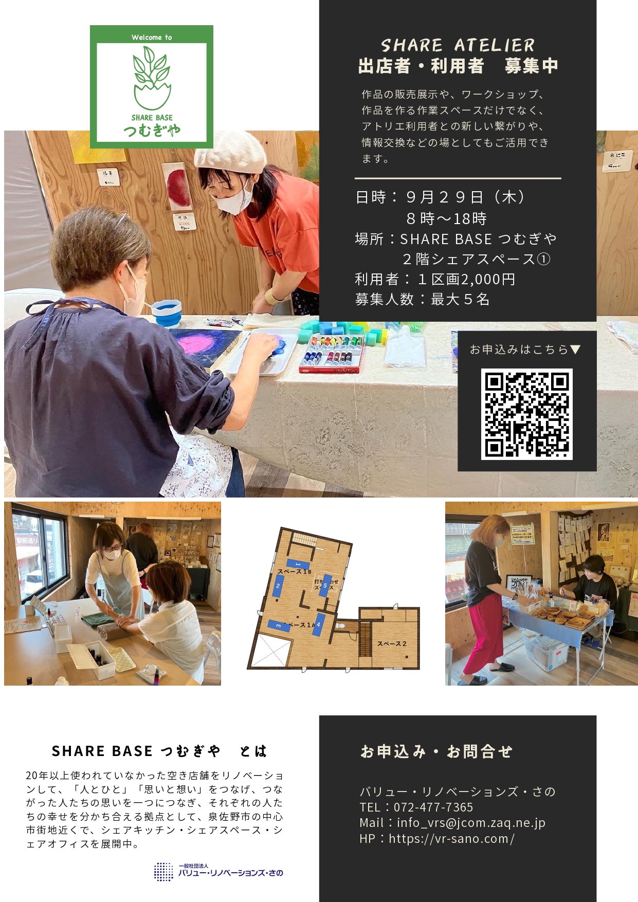 SHAREBASEつむぎや2階を「SHAREアトリエ」としてご利用いただけます。