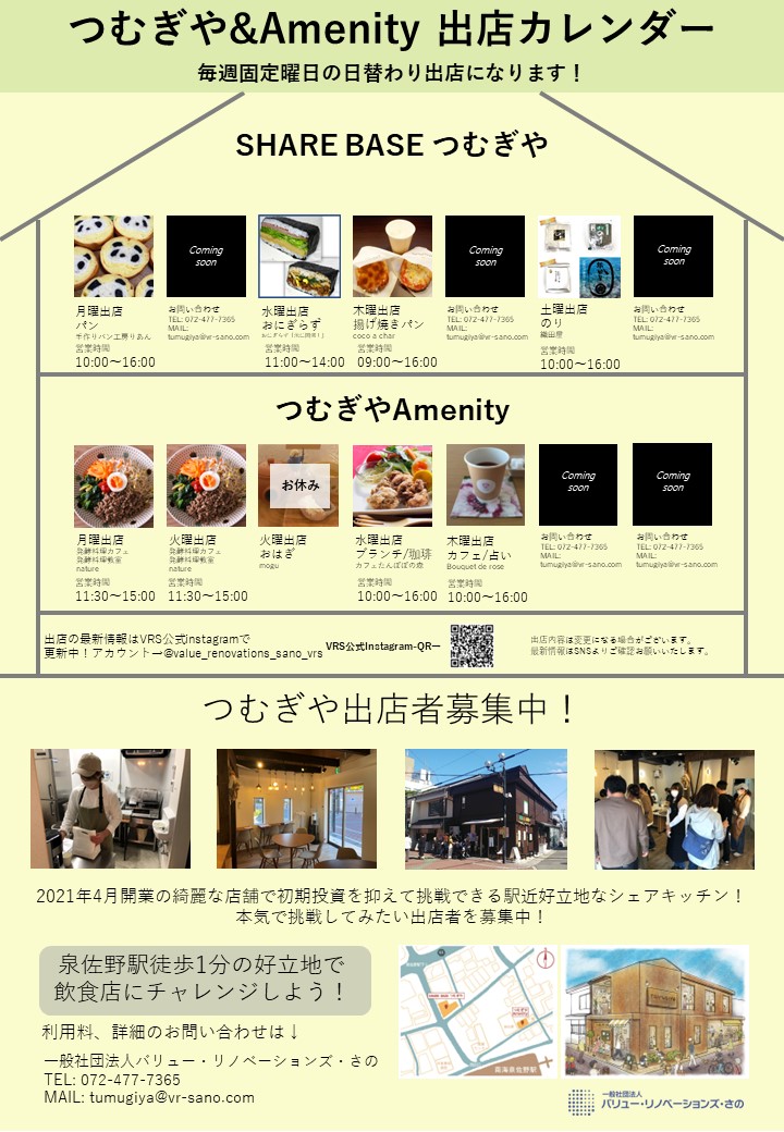 【つむぎやキッチン・Amenityカフェ】カレンダー更新致しました2022.10.31お知らせ2022年11月からの「つむぎやキッチン」及び「Amenityカフェ」の出店カレンダーを更新しましたので、お知らせします。