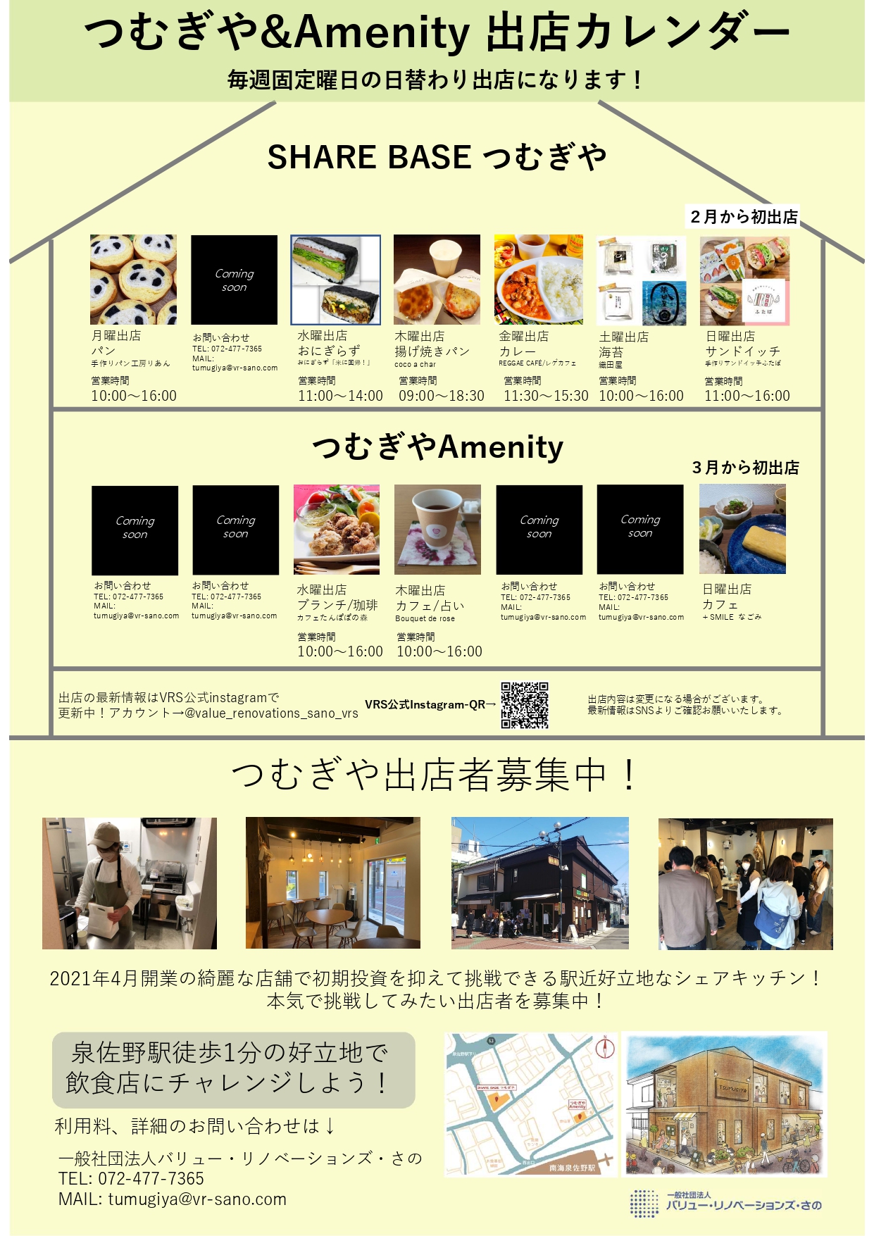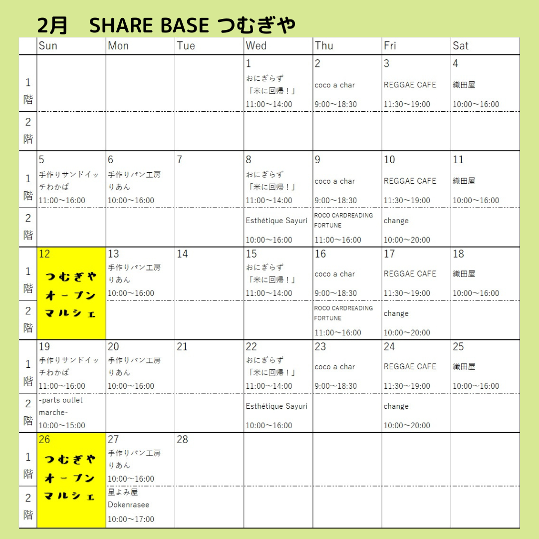 【つむぎやキッチン・つむぎや2階・Amenityカフェ】カレンダー更新致しました2023.01.31お知らせ2023年2月からの「つむぎやキッチン」及び「Amenityカフェ」の出店カレンダーを更新しましたので、お知らせします。つむぎやキッチンでは2月から毎週日曜日に新しくOPENするお店がございます。皆さまのご来店お待ちしております。