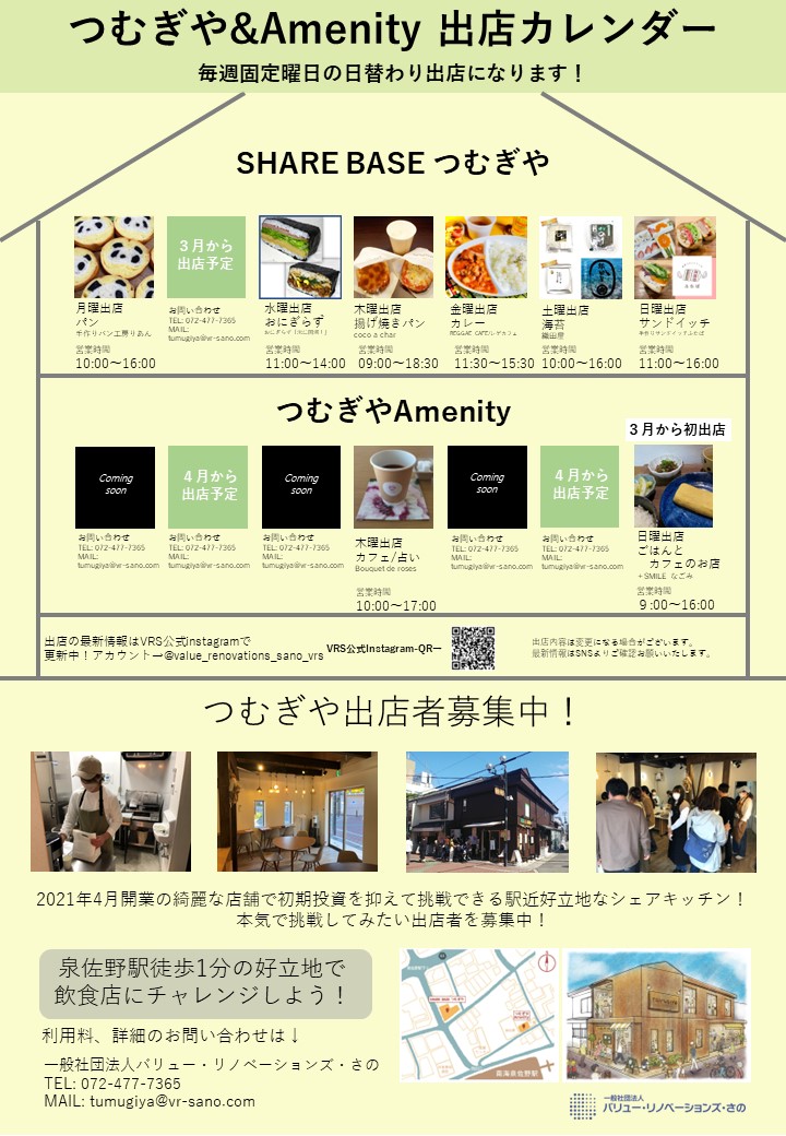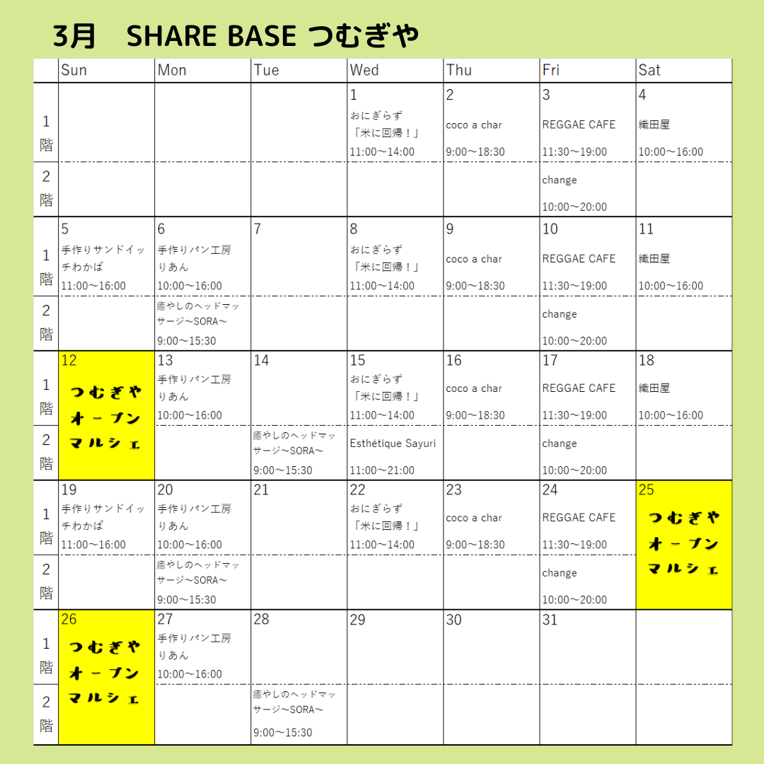 【つむぎやキッチン・つむぎや2階・Amenityカフェ】カレンダー更新致しました2023.02.28お知らせ2023年3月からの「つむぎやキッチン」及び「Amenityカフェ」の出店カレンダーを更新しましたので、お知らせします。Amenityカフェでは3月から毎週日曜日に新しくOPENするお店がございます。皆さまのご来店お待ちしております。