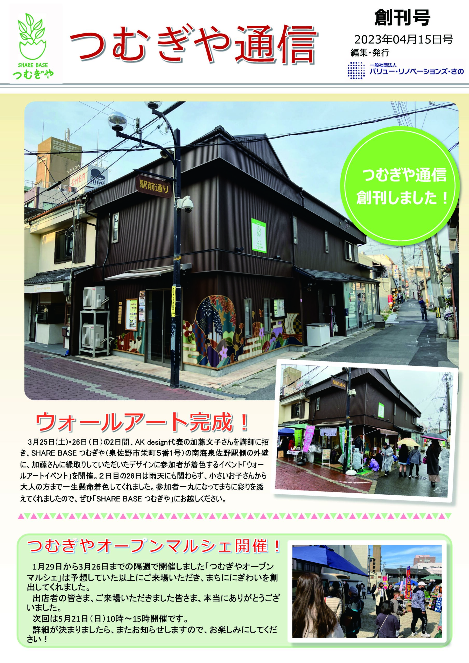 まちの瓦版「つむぎや通信」創刊しました!2023.04.15お知らせSHARE BASEつむぎやつむぎやAmenity佐野まちライブラリーエリアリノベーションプロジェクト女性活躍推進VRSのイベントやワークショップなどの取り組みや、つむぎやの出店者情報など、まちの瓦版的な役割として情報を発信する「つむぎや通信」を創刊しました。紙媒体で、VRS事務所前などで配布していますので、ぜひお手に取ってご覧ください!#瓦版#通信#まちづくり#つむぎや#情報発信#VRS#泉佐野市