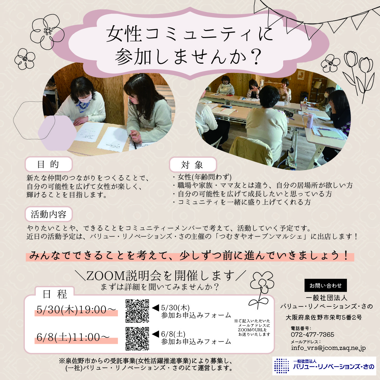 泉佐野市からの受託事業(女性活躍推進事業)により募集し、(一社)バリュー・リノベーションズ・さのにて運営します