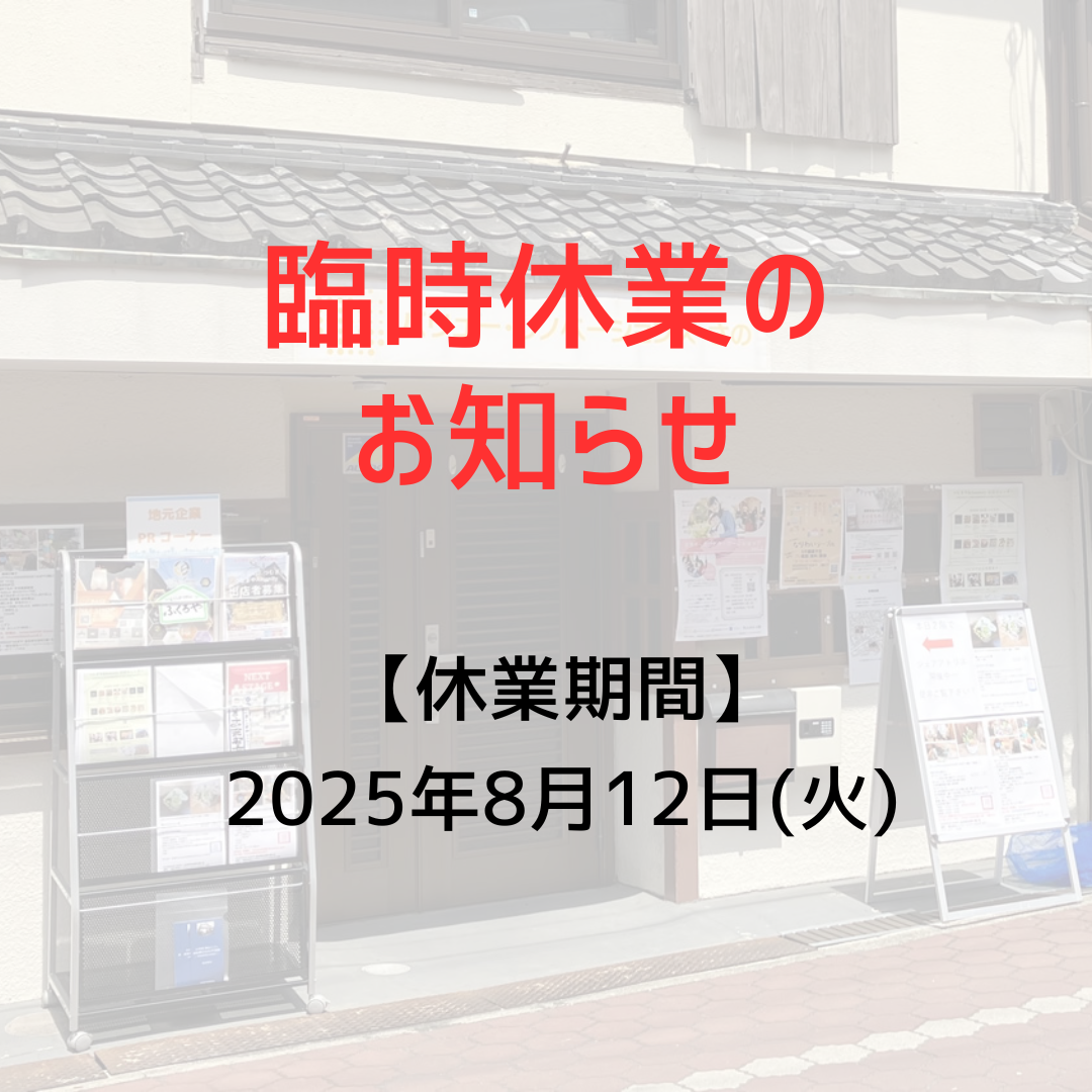 事務所臨時休業のお知らせ2025.08.10お知らせ 誠に勝手ながら、イベント振替休日の為、下記日程で事務所臨時休業とさせていただきます。 なお、弊社施設は通常通り営業しております。 ご不便をおかけいたしますが、何卒ご理解のほどよろしくお願いいたします。 【休業期間】 2025年8月12日(火) 2025年8月13日(水)より通常営業といたします。