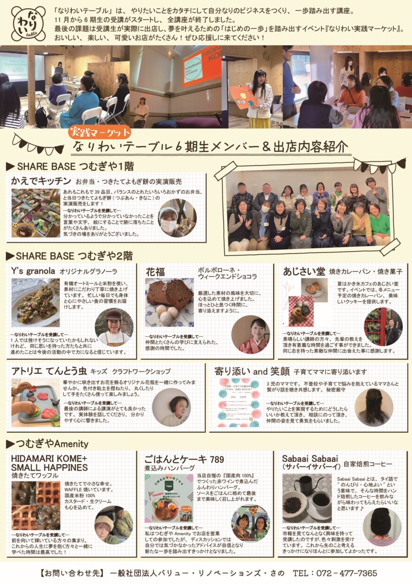 なりわいテーブル6期生メンバーと実践マーケット出店内容紹介は下記画像をご覧ください。