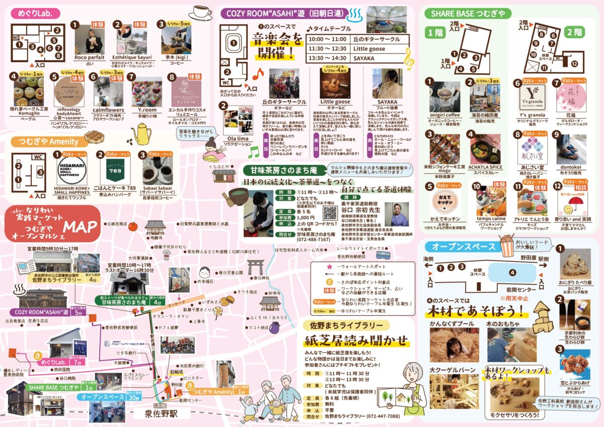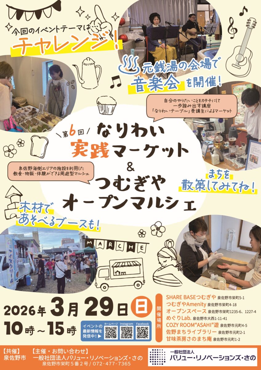 「なりわいテーブル」受講生による実践形式のマーケット「なりわい実践マーケット」と、泉佐野駅近く、海側エリアの施設を利用した飲食・物販・体験ができる周遊型マルシェ「つむぎやオープンマルシェ」を同日開催!