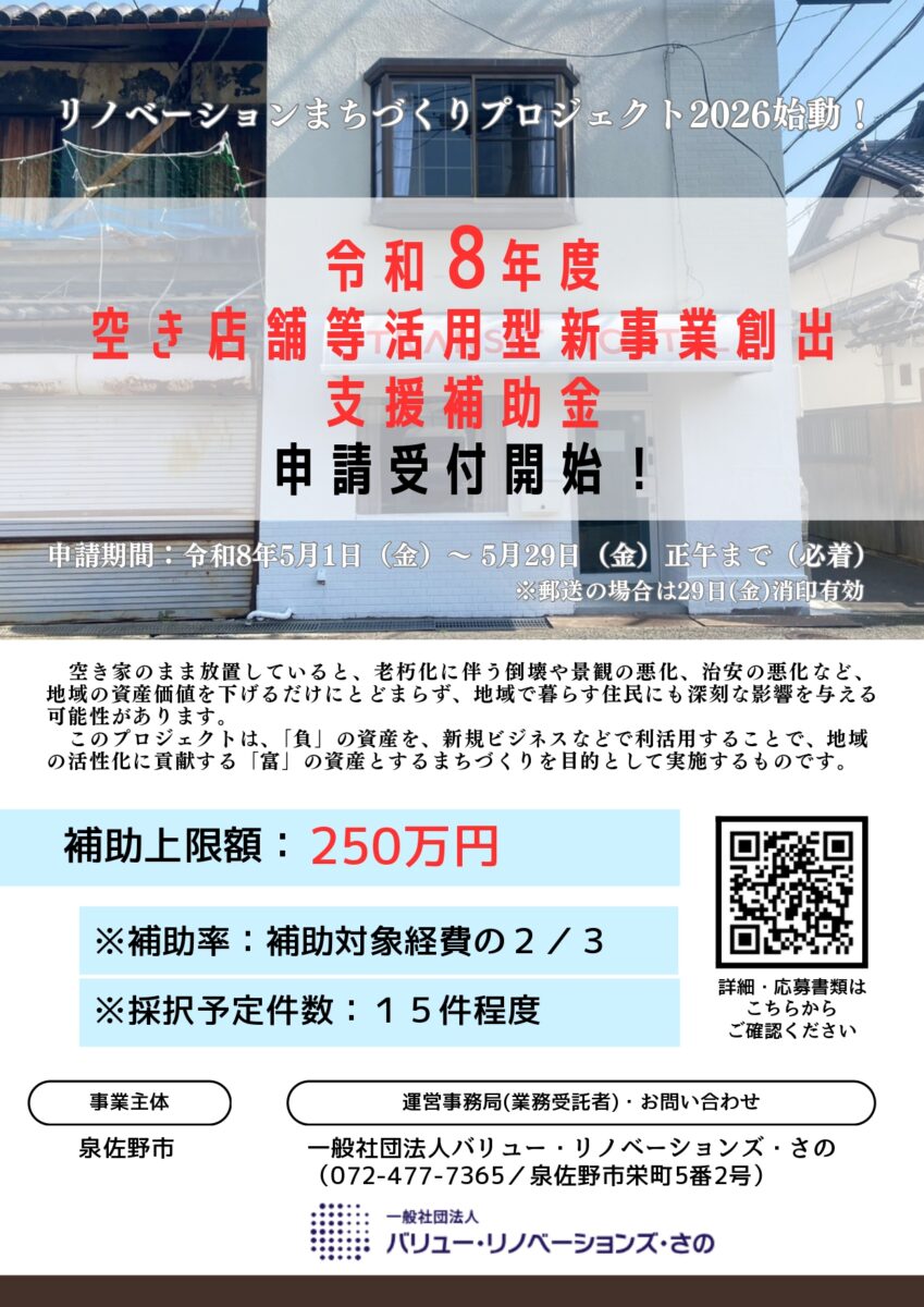 リノベーションまちづくりプロジェクト2026 ~空き店舗等活用型新事業創出支援補助金申請5月から受付~