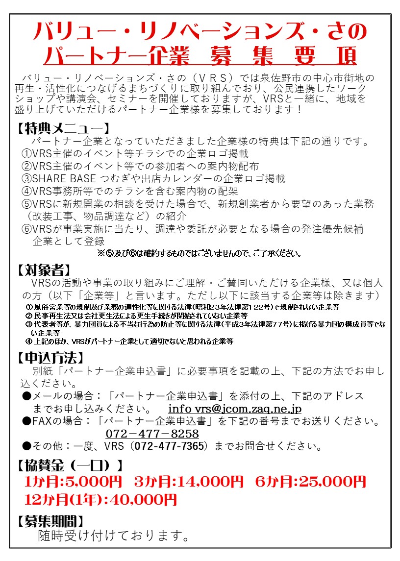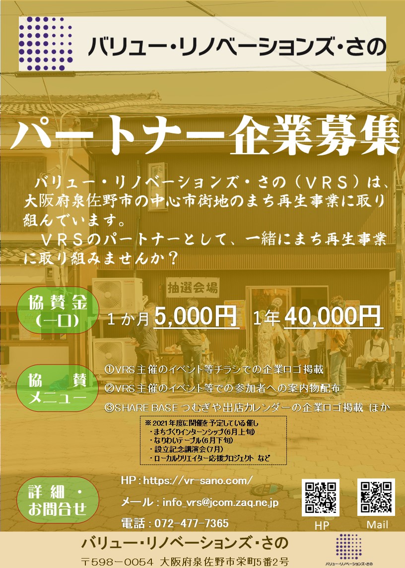 バリュー・リノベーションズ・さのでは、泉佐野市の中心市街地の 再生・活性化につなげるまちづくりに取り組んでおり、公民連携したワーク ショップや講演会、セミナーを開催しておりますが、VRSと一緒に、地域を盛り上げていただけるパートナー企業様を募集します。